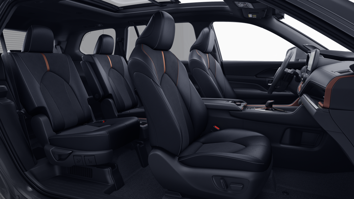 - 7-passenger seating with second-row fold-down captain's chairs and fold-down inboard armrests, adjustable headrests and two cup holders mounted on the floor; and 60/40 split, fold-down third-row seats with sliding headrests and recline function