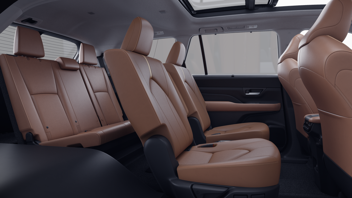 - 7-passenger seating with second-row fold-down captain's chairs and fold-down inboard armrests, adjustable headrests and two cup holders mounted on the floor; and 60/40 split, fold-down third-row seats with sliding headrests and recline function